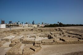 Qal'at al-Bahrain: Ancient Harbour and Capital of Dilmun is an archaeological site comprising four main elements: an archaeological tell (an artificial hill formed over time by successive occupations) of over 16 hectares, immediately adjacent to the northern coast of Bahrain; a sea tower about 1600m North-West of the tell; a sea channel of just under 16 hectares through the reef near the sea tower, and palm-groves. The palm-groves and traditional agricultural gardens surround the site within the whole area of the land component of the buffer zone, being particularly noticeable on the Western and Northern sides, but also occurring on the Eastern and South-Eastern sides. The property is situated in the Northern Governorate, in Al Qalah village district on the northern coast about 5.5 km West of Manama, the present capital of Bahrain.